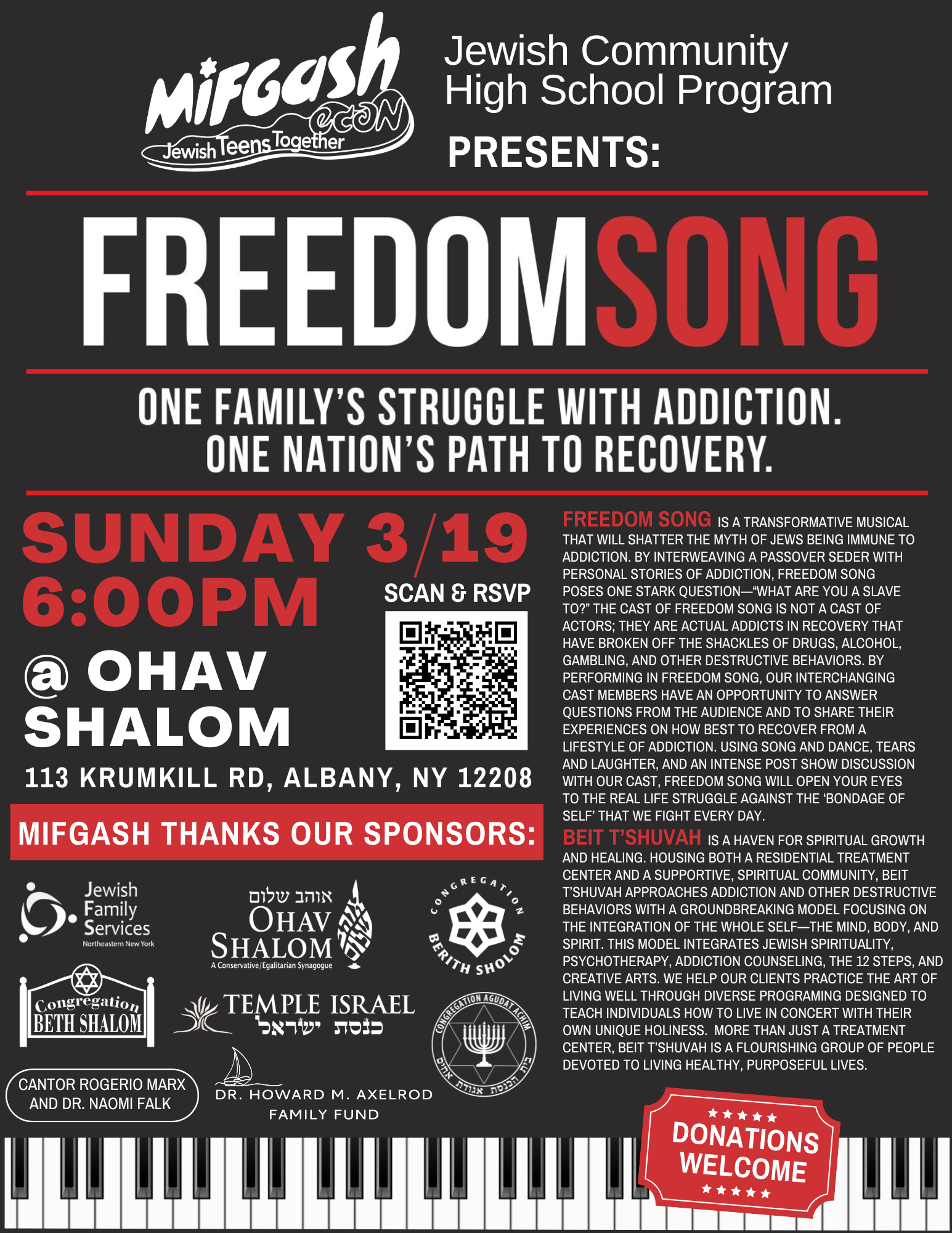 A transformative musical production that interweaves a Passover Seder with personal stories of addiction, Freedom Song poses one stark question—“what are you a slave to?” By interweaving a Passover Seder with personal stories of addiction, Freedom Song poses one stark question—“what are you a slave to?” The cast of Freedom Song is not a cast of actors; they are actual addicts in recovery that have broken off the shackles of drugs, alcohol, gambling, and other destructive behaviors. By performing in Freedom Song, our interchanging cast members have an opportunity to answer questions from the audience and share their experiences on how best to recover from a lifestyle of addiction. Using song and dance, tears and laughter, and an intense post-show discussion with our cast, Freedom Song will open your eyes to the real-life struggle against the ‘bondage of self’ that we fight every day.