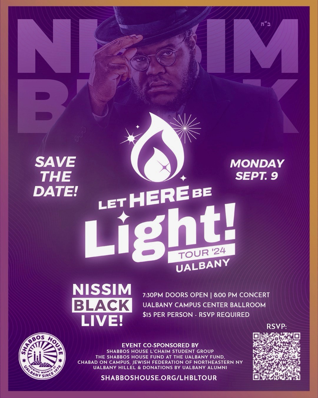 Nissim Black in concert Monday evening Sept 9th at UAlbany in conjunction with the Chabad on Campus "Let HERE Be Light!" Tour 2024.